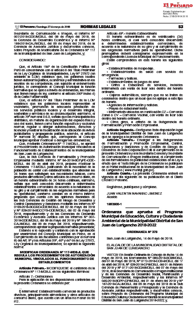 La presente Ordenanza aprueba el Programa Municipal de Educación, Cultura y Ciudadanía Ambiental de la Municipalidad Distrital de San Juan de Lurigancho, para el periodo 2018 - 2022; con la finalidad de promover la cultura y la educación ambiental para la formación de ciudadanas y ciudadanos ambientalmente responsables e incentivar la participación ciudadana en todos sus niveles.