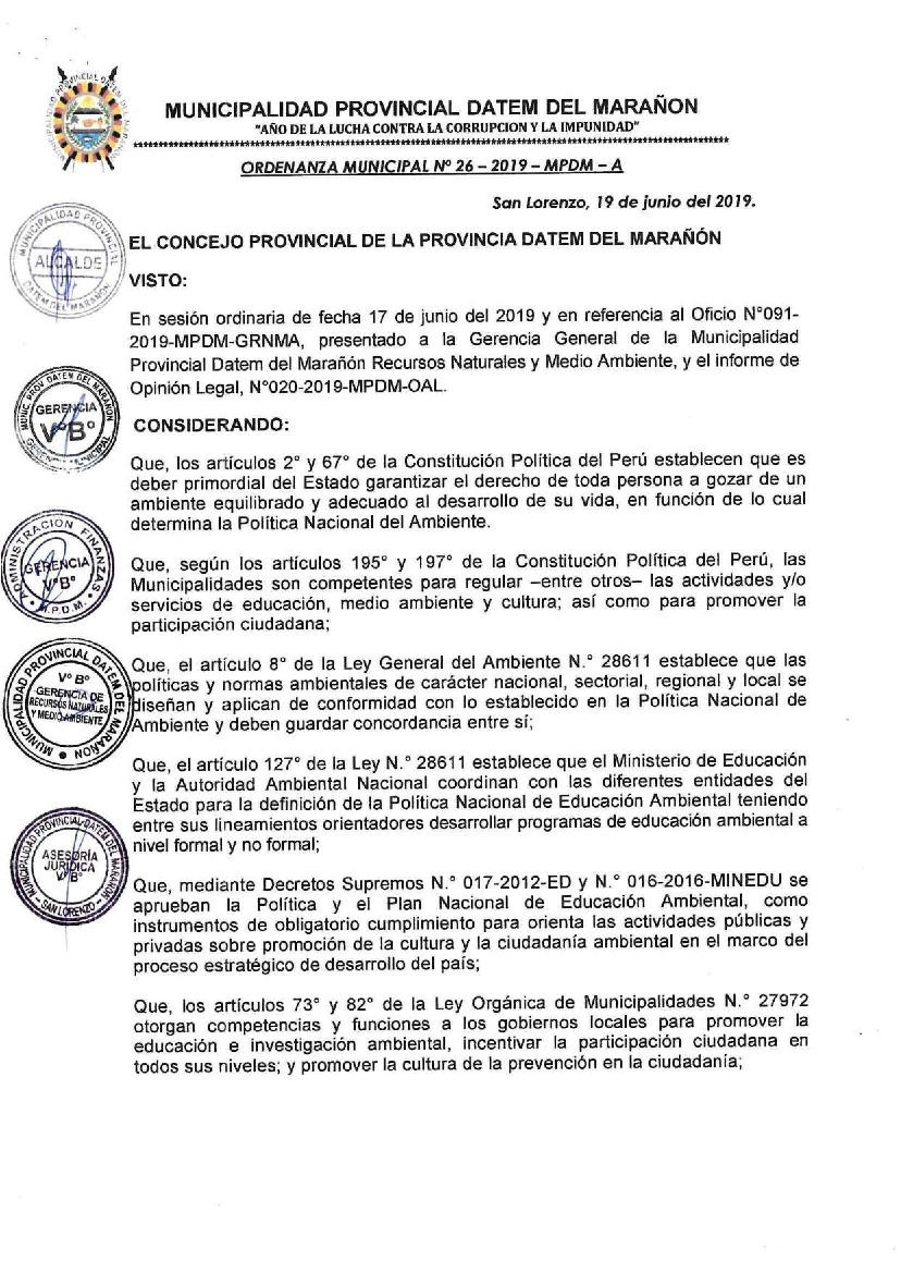 La presente Ordenanza aprueba el Programa Municipal de Educación, Cultura y Ciudadanía Ambiental de la Municipalidad Provincial de Datem del Marañón, para el periodo 2019 - 2022; con la finalidad de promover la cultura y la educación ambiental para la formación de ciudadanas y ciudadanos ambientalmente responsables e incentivar la participación ciudadana en todos sus niveles.