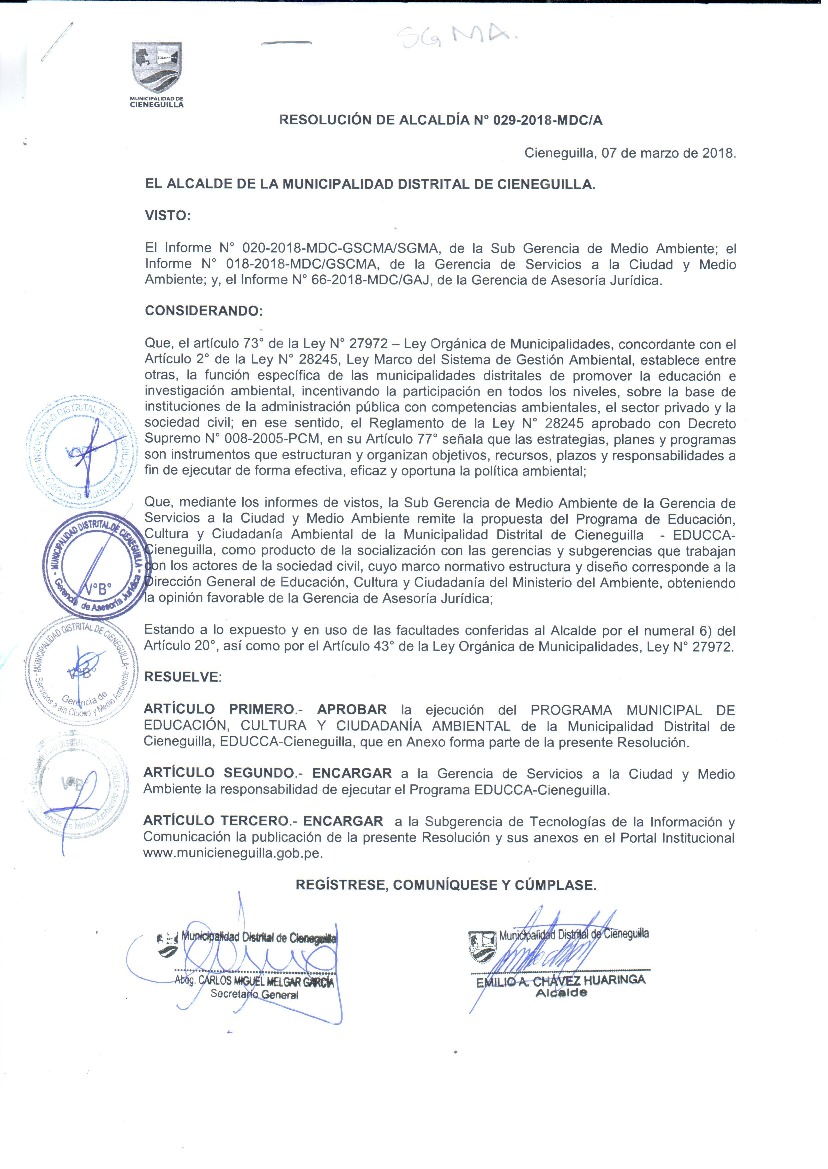 La presente Resolución aprueba el Programa Municipal de Educación, Cultura y Ciudadanía Ambiental de la Municipalidad Distrital de Cieneguilla, para el periodo 2018 - 2022; con la finalidad de promover la cultura y la educación ambiental para la formación de ciudadanas y ciudadanos ambientalmente responsables e incentivar la participación ciudadana en todos sus niveles.