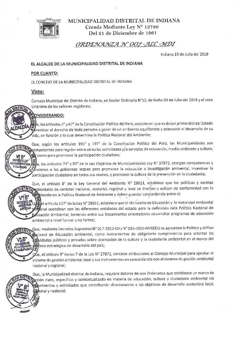 La presente Ordenanza aprueba el Programa Municipal de Educación, Cultura y Ciudadanía Ambiental de la Municipalidad Distrital de Indiana, para el periodo 2019 - 2022; con la finalidad de promover la cultura y la educación ambiental para la formación de ciudadanas y ciudadanos ambientalmente responsables e incentivar la participación ciudadana en todos sus niveles.