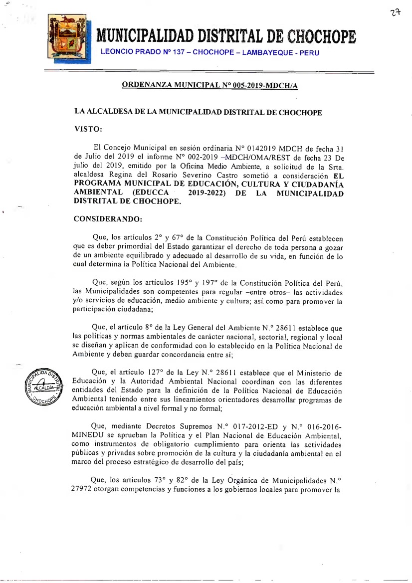 La presente Ordenanza aprueba el Programa Municipal de Educación, Cultura y Ciudadanía Ambiental de la Municipalidad Distrital de Chochope, para el periodo 2019 - 2022; con la finalidad de promover la cultura y la educación ambiental para la formación de ciudadanas y ciudadanos ambientalmente responsables e incentivar la participación ciudadana en todos sus niveles.