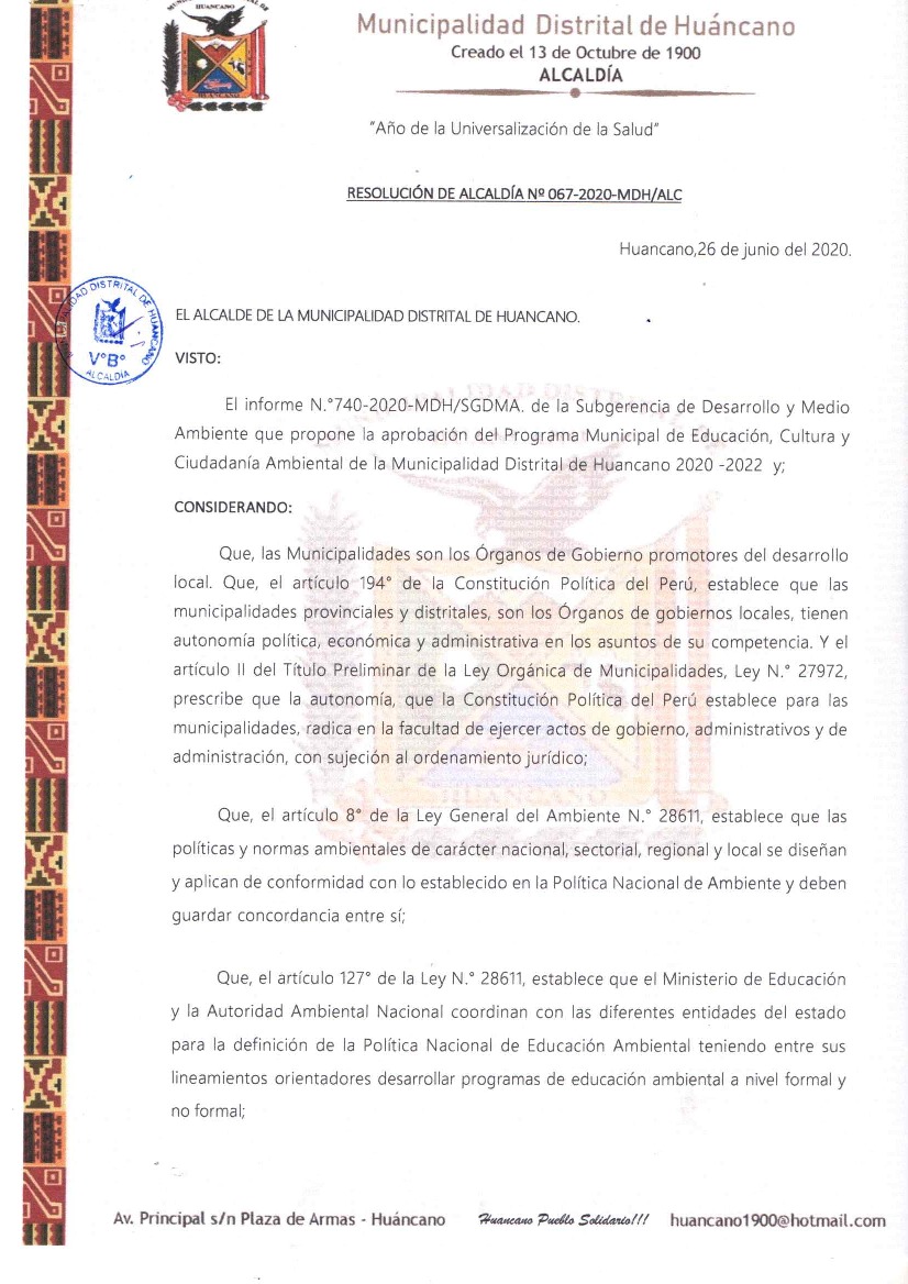 La presente Resolución aprueba el Programa Municipal de Educación, Cultura y Ciudadanía Ambiental de la Municipalidad Distrital de Huancano– PISCO (ICA), para el periodo 2020 -2022; con la finalidad de promover la cultura y la educación ambiental para la formación de ciudadanas y ciudadanos ambientalmente responsables e incentivar la participación ciudadana en todos sus niveles.