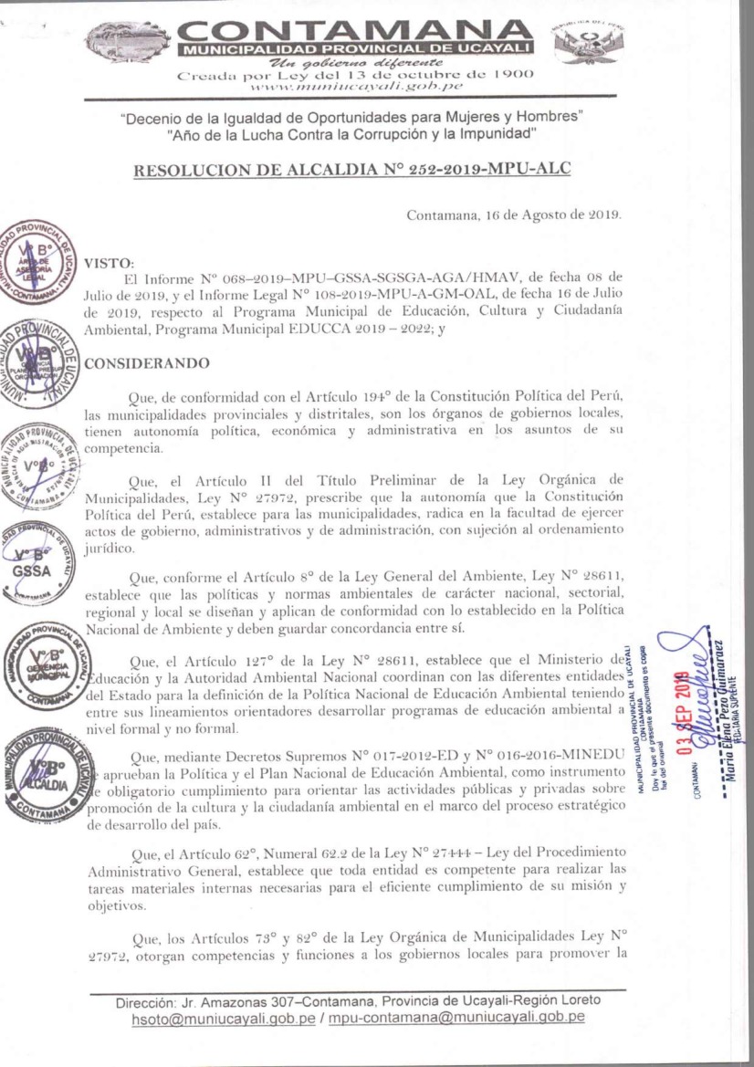 Programa Municipal de Educación, Cultura y Ciudadanía Ambiental de la Municipalidad Provincia de Ucayali 2019 - 2022