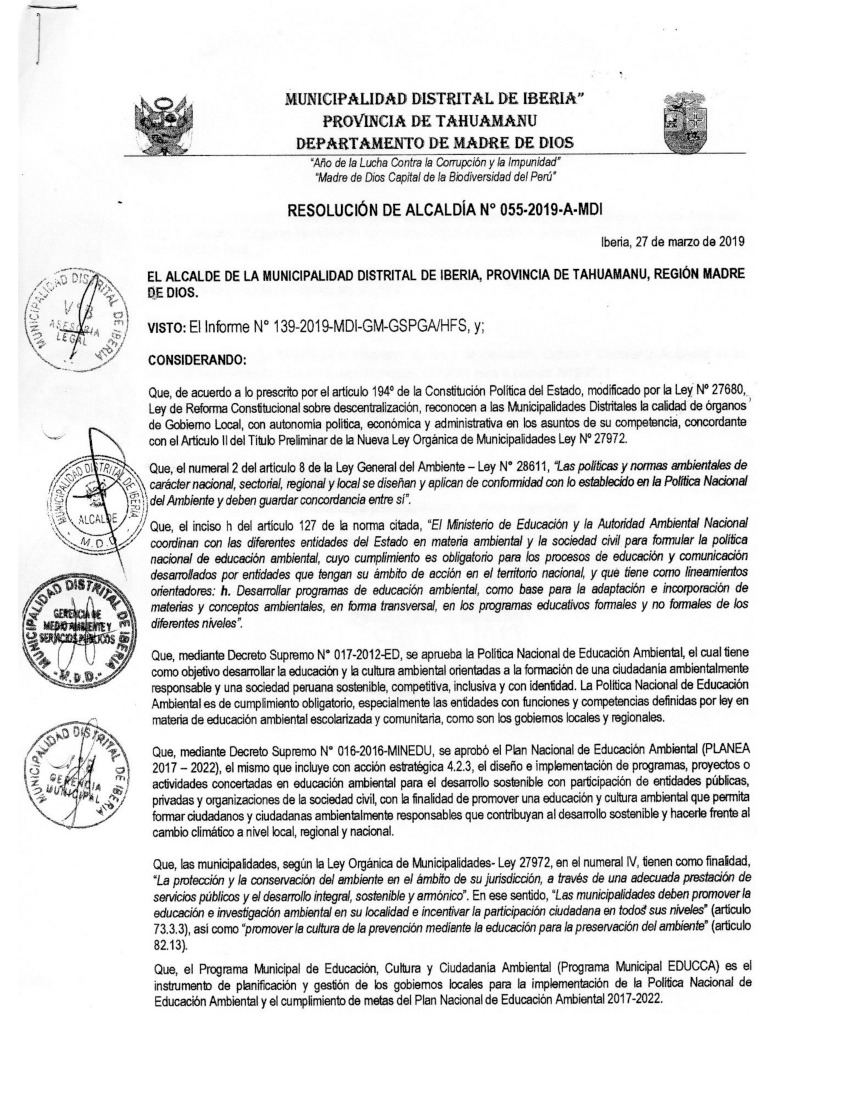 La presente Resolución aprueba el Programa Municipal de Educación, Cultura y Ciudadanía Ambiental de la Municipalidad Distrital de Iberia, para el periodo 2019 - 2022; con la finalidad de promover la cultura y la educación ambiental para la formación de ciudadanas y ciudadanos ambientalmente responsables e incentivar la participación ciudadana en todos sus niveles.