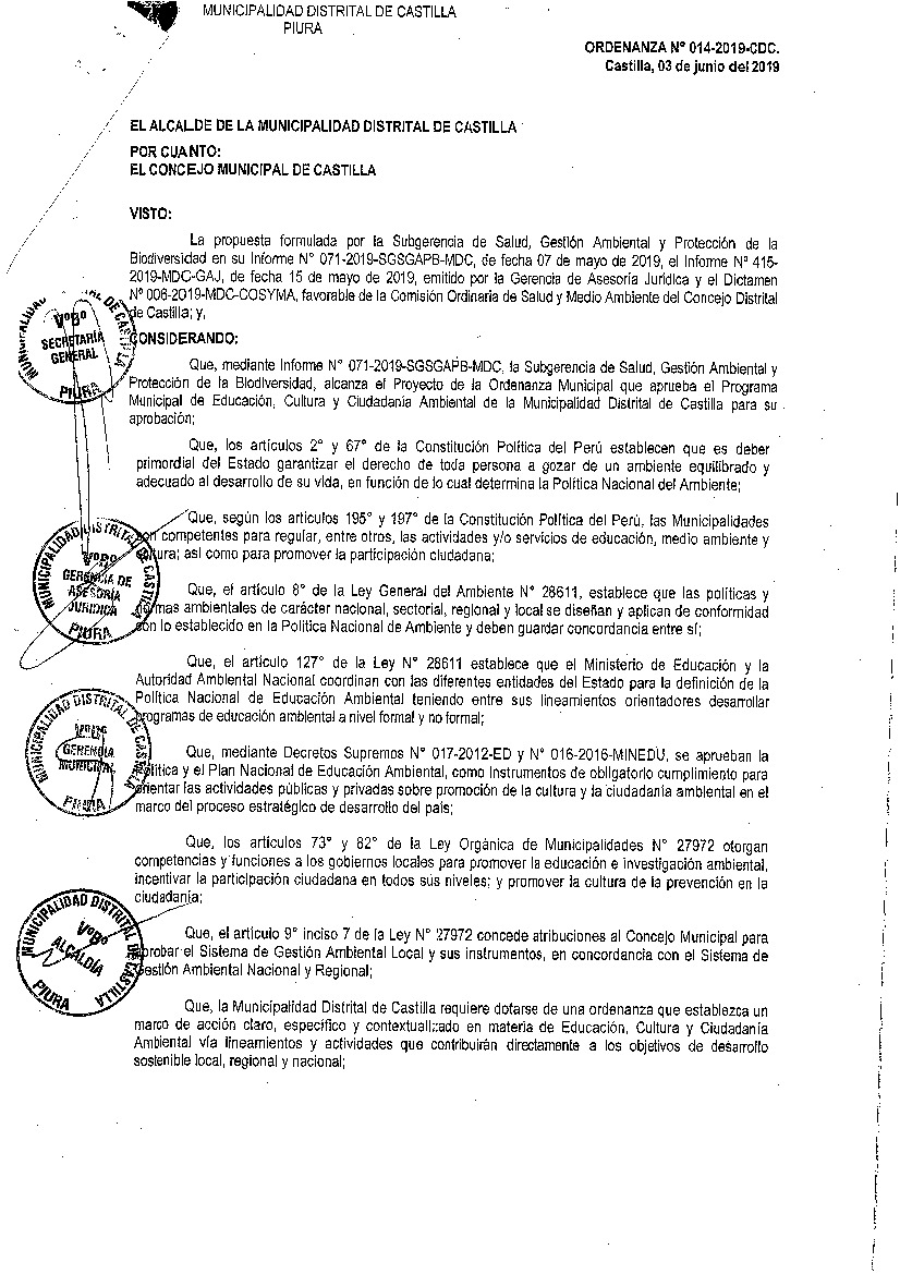 La presente Ordenanza aprueba el Programa Municipal de Educación, Cultura y Ciudadanía Ambiental de la Municipalidad Distrital de Castilla, para el periodo 2019 - 2022; con la finalidad de promover la cultura y la educación ambiental para la formación de ciudadanas y ciudadanos ambientalmente responsables e incentivar la participación ciudadana en todos sus niveles.