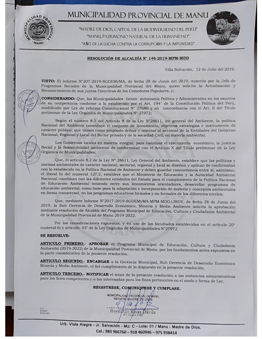 La presente Resolución aprueba el Programa Municipal de Educación, Cultura y Ciudadanía Ambiental de la Municipalidad Provincial de Manu, para el periodo 2019 - 2022; con la finalidad de promover la cultura y la educación ambiental para la formación de ciudadanas y ciudadanos ambientalmente responsables e incentivar la participación ciudadana en todos sus niveles.