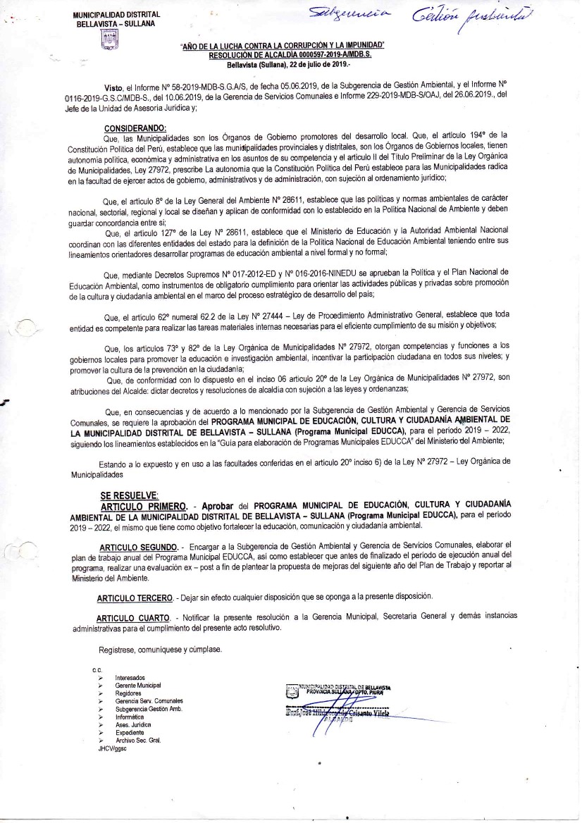 La presente Resolución aprueba el Programa Municipal de Educación, Cultura y Ciudadanía Ambiental de la Municipalidad Distrital de Bellavista, para el periodo 2019 - 2022; con la finalidad de promover la cultura y la educación ambiental para la formación de ciudadanas y ciudadanos ambientalmente responsables e incentivar la participación ciudadana en todos sus niveles.