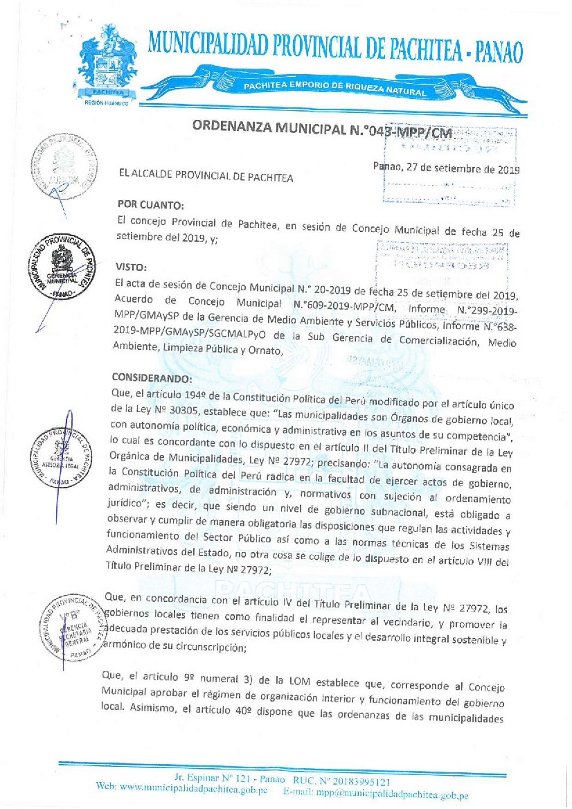 La presente Ordenanza aprueba el Programa Municipal de Educación, Cultura y Ciudadanía Ambiental de la Municipalidad Provincial de Pachitea, para el periodo 2019 - 2022; con la finalidad de promover la cultura y la educación ambiental para la formación de ciudadanas y ciudadanos ambientalmente responsables e incentivar la participación ciudadana en todos sus niveles.