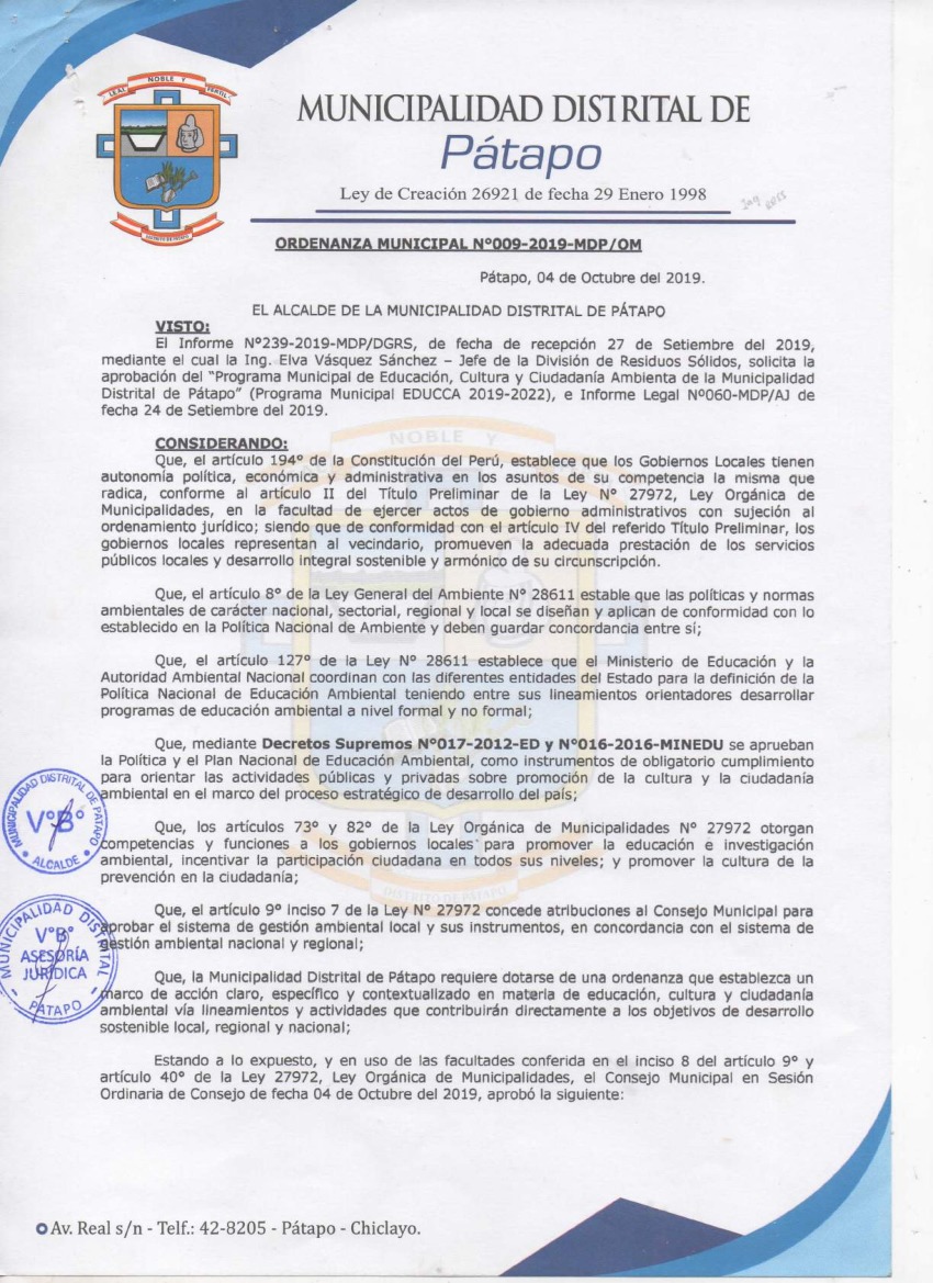 Programa Municipal de Educación, Cultura y Ciudadanía Ambiental de la Municipalidad Distrital de Pátapo 2019 – 2022