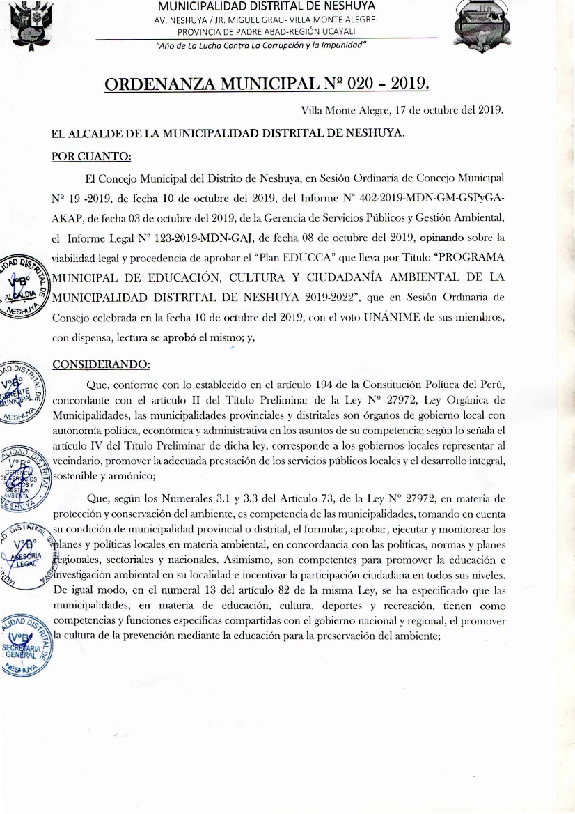 Programa Municipal de Educación, Cultura y Ciudadanía Ambiental de la Municipalidad Distrital de Neshuya 2019 – 2022