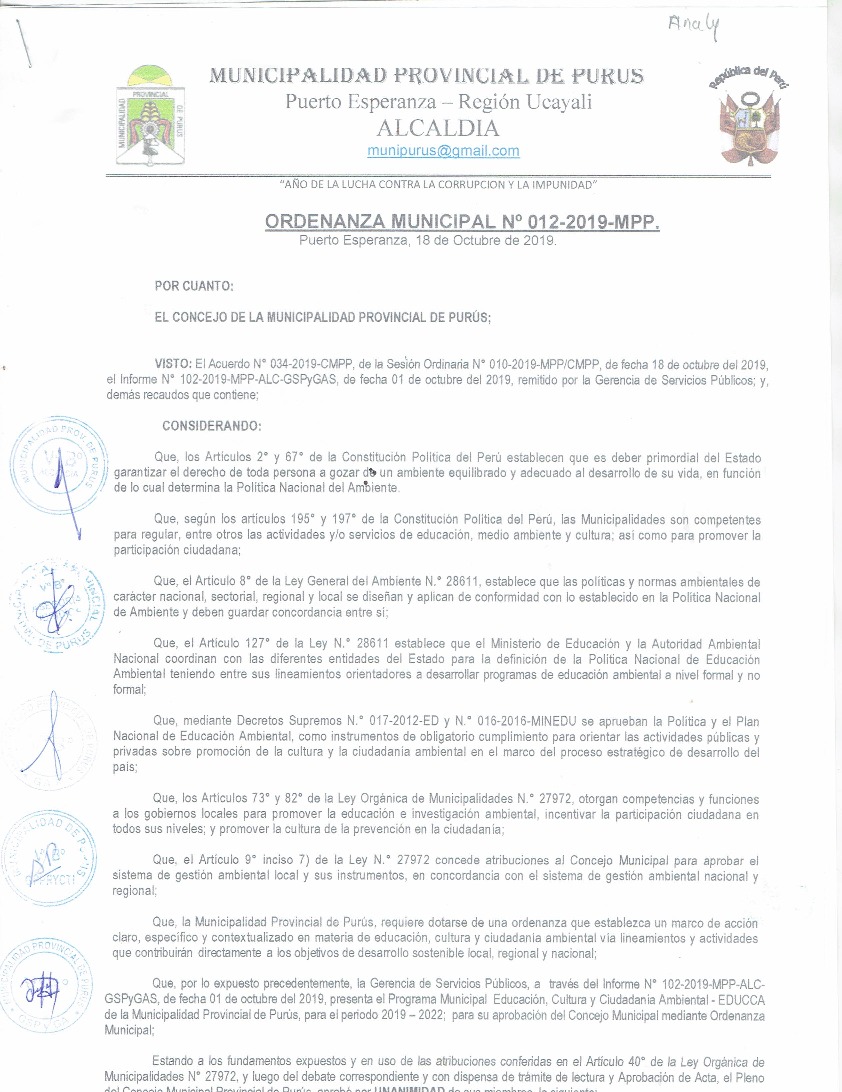 Programa Municipal de Educación, Cultura y Ciudadanía Ambiental de la Municipalidad Provincial de Purús 2019 – 2022