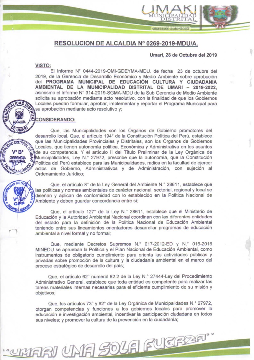 La presente Resolución aprueba el Programa Municipal de Educación, Cultura y Ciudadanía Ambiental de la Municipalidad Distrital de Umari, para el periodo 2019 - 2022; con la finalidad de promover la cultura y la educación ambiental para la formación de ciudadanas y ciudadanos ambientalmente responsables e incentivar la participación ciudadana en todos sus niveles.
