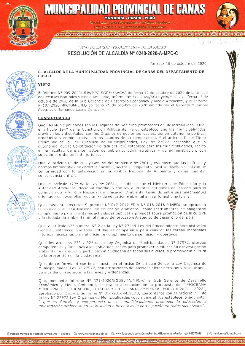 La presente Resolución aprueba el Programa Municipal de Educación, Cultura y Ciudadanía Ambiental de la Municipalidad Provincial de Canas, para el periodo 2020-2022; con la finalidad de promover la cultura y la educación ambiental para la formación de ciudadanos y ciudadanas ambientalmente responsables e incentivar la participación ciudadana en todos sus niveles.