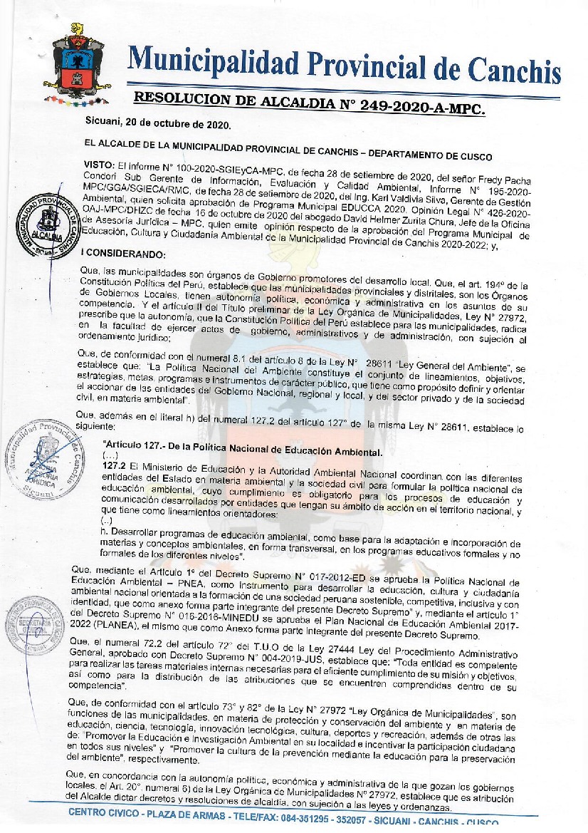 La presente Resolución aprueba el Programa Municipal de Educación, Cultura y Ciudadanía Ambiental de la Municipalidad Provincial de Canchis para el periodo 2020-2022; con la finalidad de promover la cultura y la educación ambiental para la formación de ciudadanas y ciudadanos ambientalmente responsables e incentivar la participación ciudadana en todos sus niveles.