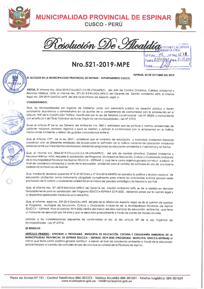 La presente Resolución aprueba el Programa Municipal de Educación, Cultura y Ciudadanía Ambiental de la Municipalidad Provincial de Espinar, para el periodo 2019-2022, con la finalidad de promover la cultura y la educación ambiental para la formación de ciudadanas y ciudadanos ambientalmente responsables e incentivar la participación ciudadana en todos sus niveles.