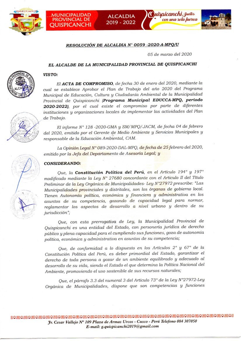 La presente Resolución aprueba el Programa Municipal de Educación, Cultura y Ciudadanía Ambiental de la Municipalidad Provincial de Quispicanchi, para el periodo 2020-2022; con la finalidad de proover la cultura y la educación ambiental para la formación de ciudadanas y ciudadanos ambientalmente responsables e incentivar la participación ciudadana en todos sus niveles.