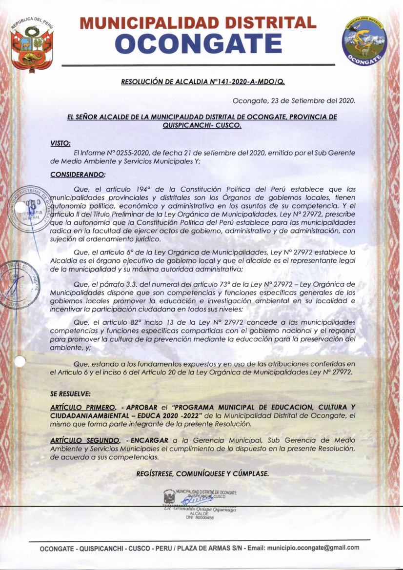 La presente Resolución de alcaldía aprueba el Programa Municipal de Educación, Cultura y Ciudadanía Ambiental de la Municipalidad Distrital de Ocongate, para el periodo 2020-2022; con la finalidad de promover la cultura y la educación ambiental para la formación de ciudadanas y ciudadanos ambientalmente responsables e incentivar la participación ciudadana en todos sus nvieles.