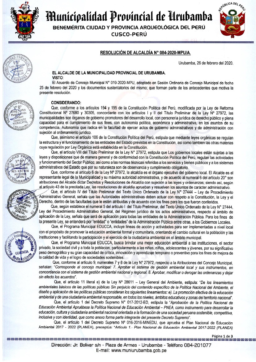 La presente resolución aprueba el Programa Municipal de Educación, Cultura y Ciudadanía Ambiental de la Municipalidad Provincial de Urubamba para el periodo 2020-2022; con la finalidad de promover la cultura y la educación ambiental para la formación de ciudadanas y ciudadanos ambientalmente responsables e incentivar la participación ciudadana en todos sus niveles.
