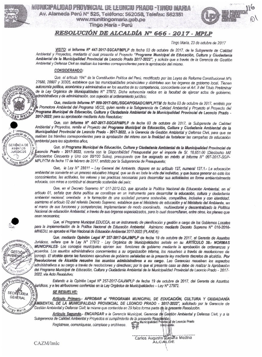 La presente Resolución aprueba el Programa Municipal de Educación, Cultura y Ciudadanía Ambiental de la Municipalidad Provincial de Leoncio Prado, para el periodo 2017 - 2022; con la finalidad de promover la cultura y la educación ambiental para la formación de ciudadanas y ciudadanos ambientalmente responsables e incentivar la participación ciudadana en todos sus niveles.