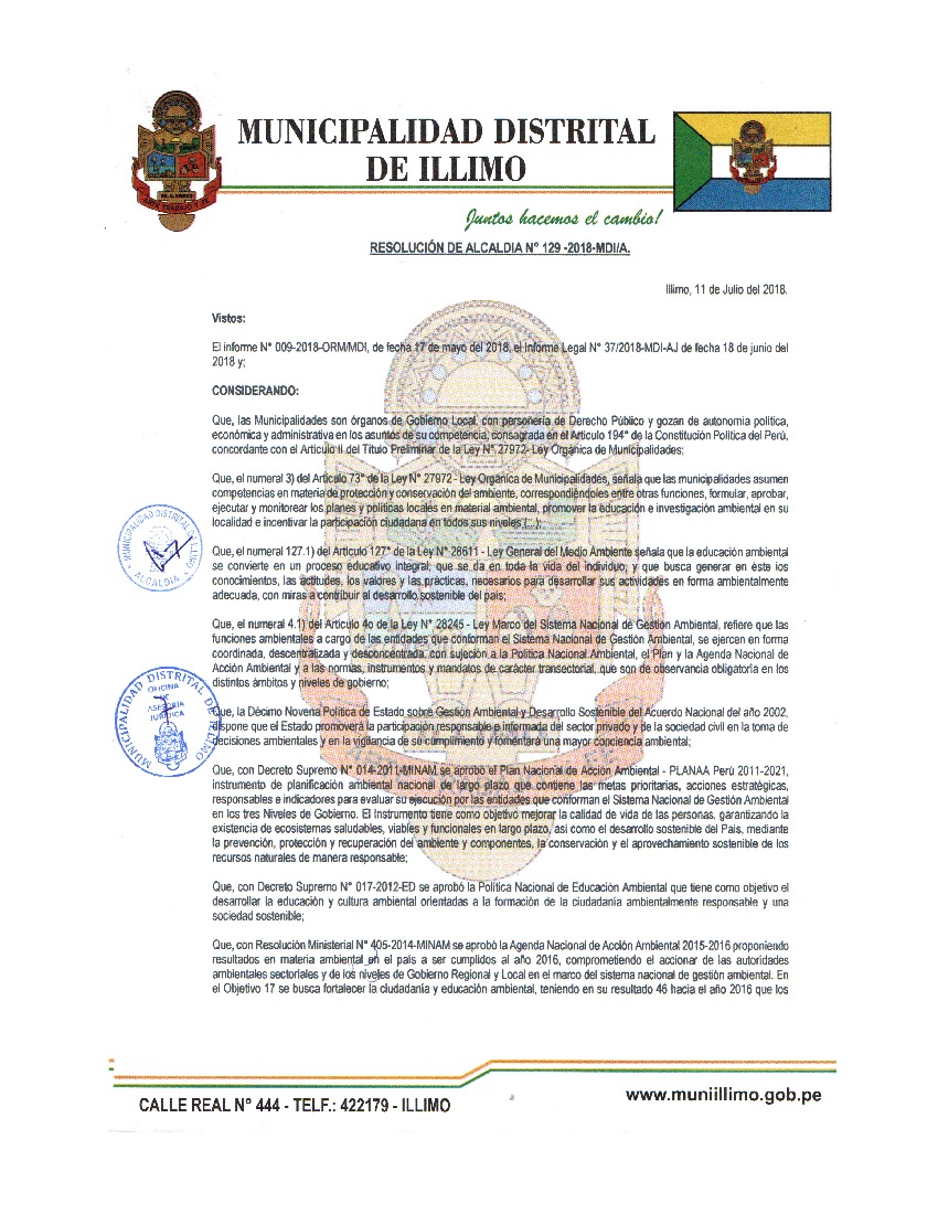 La presente Resolución aprueba el Programa Municipal de Educación, Cultura y Ciudadanía Ambiental de la Municipalidad Distrital de Illimo, para el periodo 2018 - 2022; con la finalidad de promover la cultura y la educación ambiental para la formación de ciudadanas y ciudadanos ambientalmente responsables e incentivar la participación ciudadana en todos sus niveles.