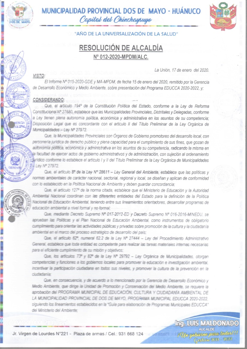 Programa Municipal de Educación, Cultura y Ciudadanía Ambiental de la Municipalidad Provincia de Dos de Mayo 2020 - 2022