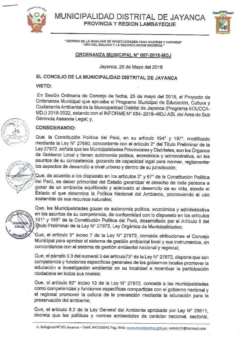 La presente Ordenanza aprueba el Programa Municipal de Educación, Cultura y Ciudadanía Ambiental de la Municipalidad Distrital de Jayanca, para el periodo 2018 - 2022; con la finalidad de promover la cultura y la educación ambiental para la formación de ciudadanas y ciudadanos ambientalmente responsables e incentivar la participación ciudadana en todos sus niveles.