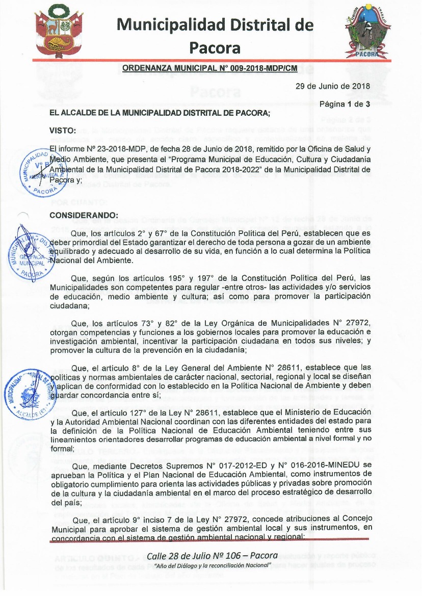 Programa Municipal de Educación, Cultura y Ciudadanía Ambiental de la Municipalidad Distrital de Pacora 2018 – 2022
