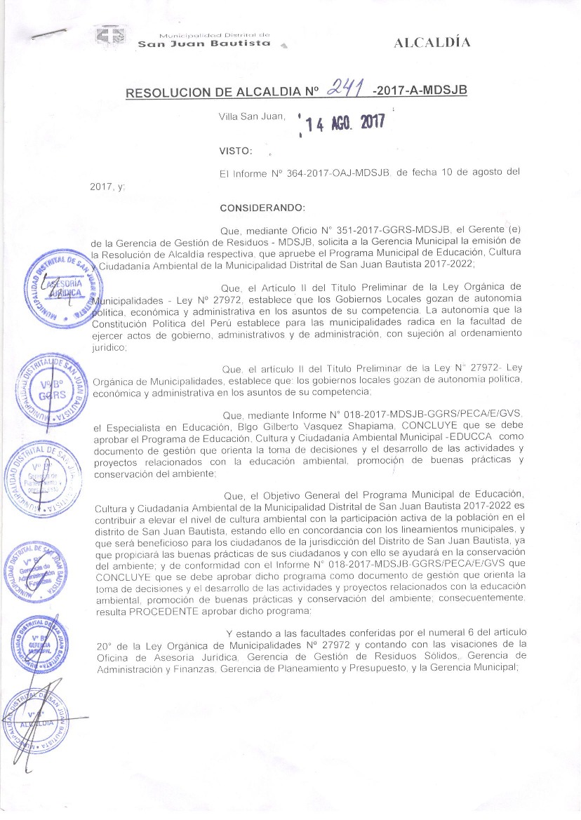 La presente Resolución aprueba el Programa Municipal de Educación, Cultura y Ciudadanía Ambiental de la Municipalidad Distrital de San Juan Bautista, para el periodo 2017 - 2022; con la finalidad de promover la cultura y la educación ambiental para la formación de ciudadanas y ciudadanos ambientalmente responsables e incentivar la participación ciudadana en todos sus niveles.