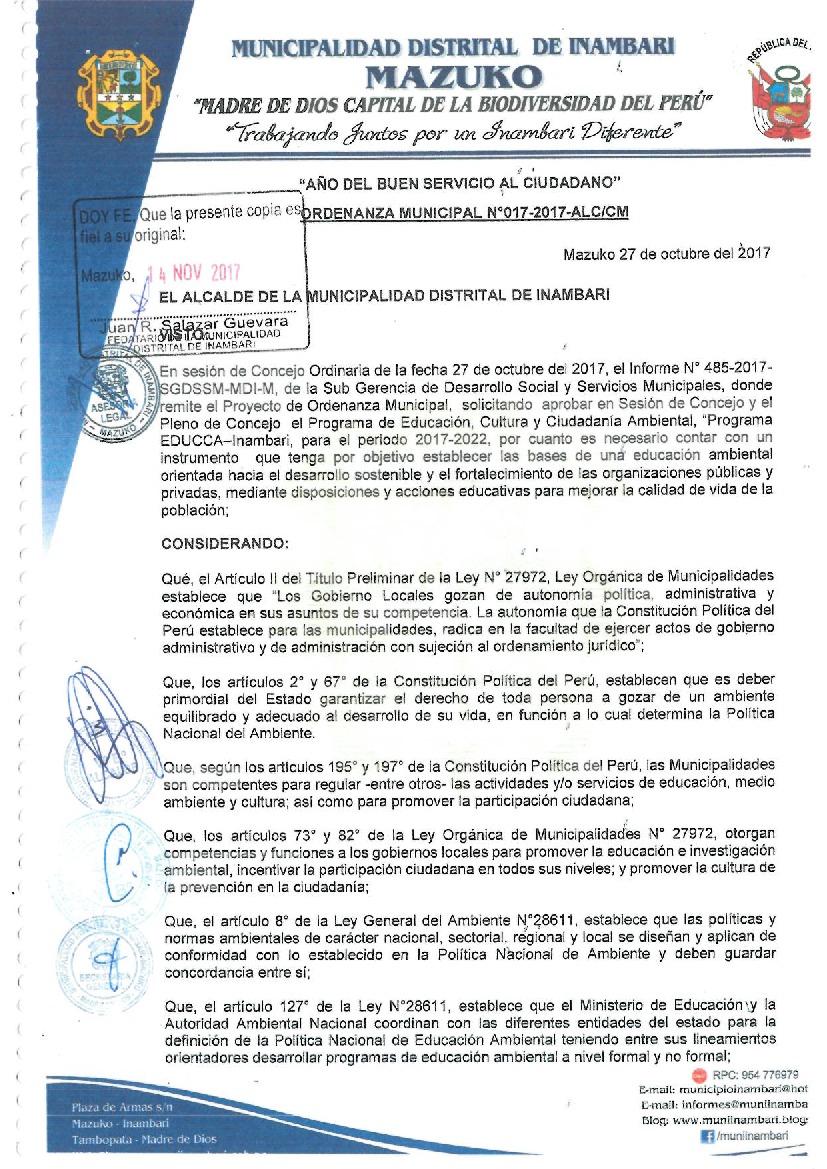 Programa Municipal de Educación, Cultura y Ciudadanía Ambiental de la Municipalidad Distrital de Inambari 2017 – 2022