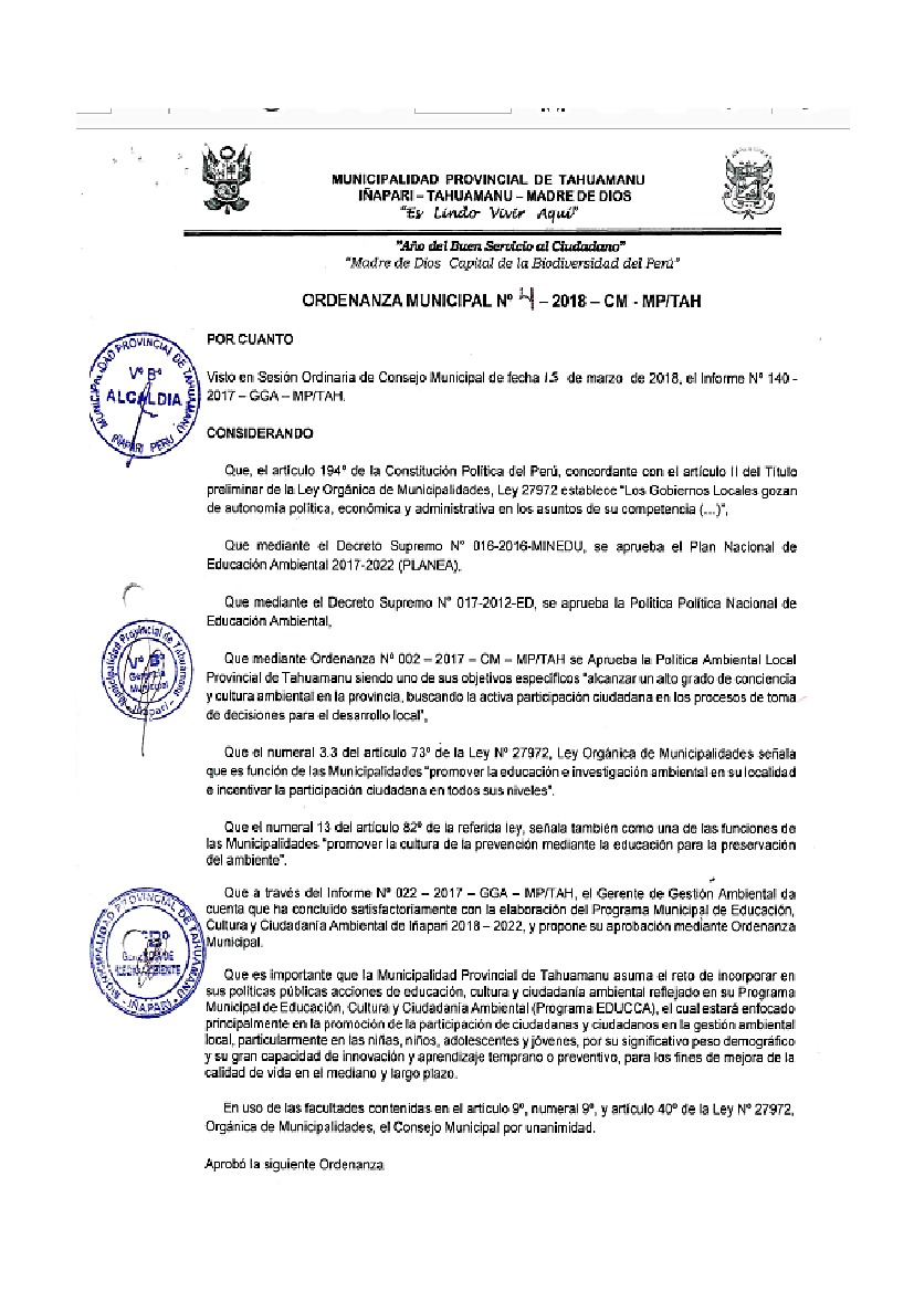 Programa Municipal de Educación, Cultura y Ciudadanía Ambiental de la Municipalidad Provincial de Tahuamanu 2018 – 2022