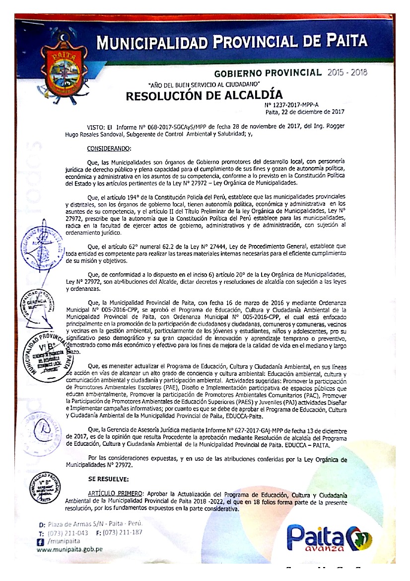 Programa Municipal de Educación, Cultura y Ciudadanía Ambiental de la Municipalidad Provincia de Paita 2018 – 2022