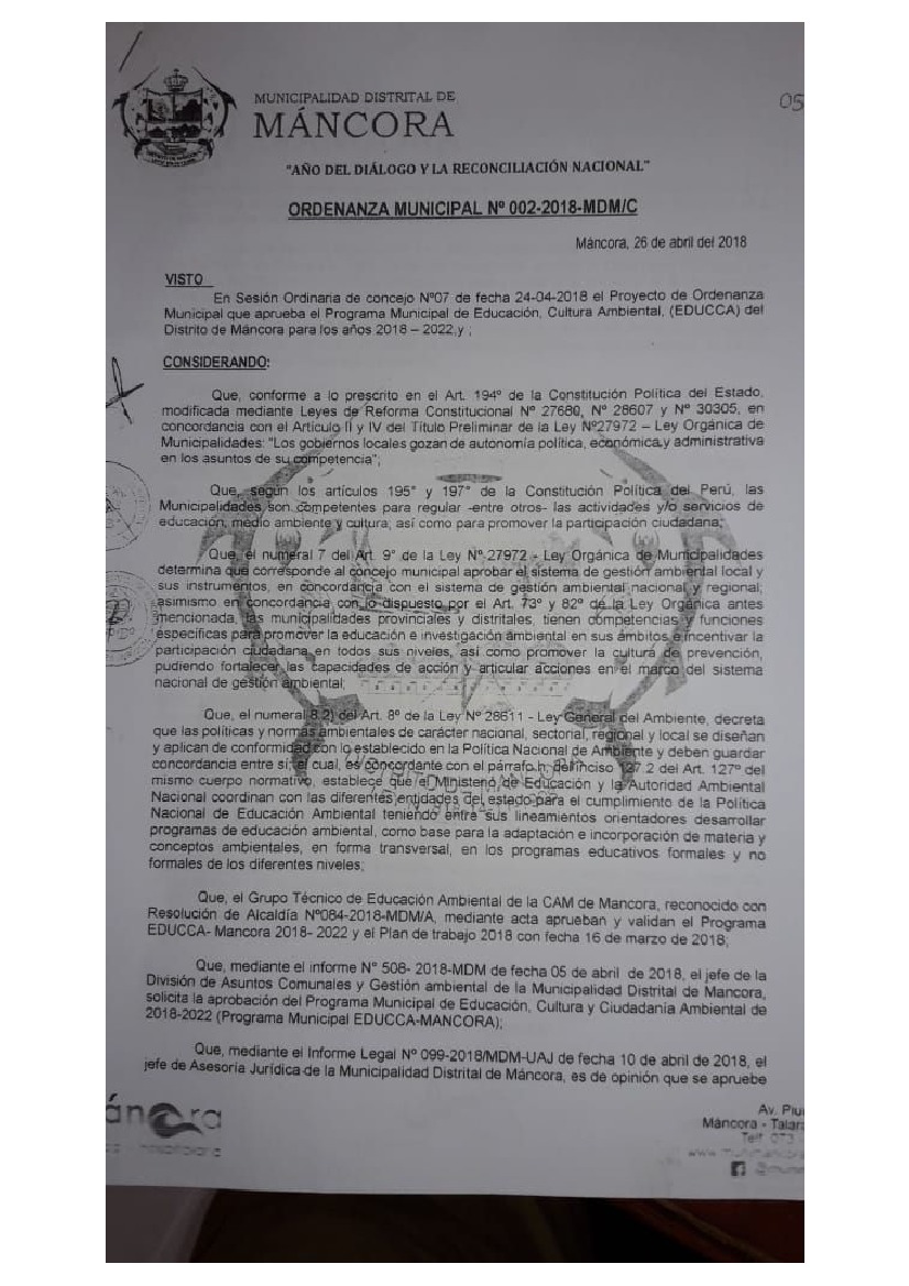 Programa Municipal de Educación, Cultura y Ciudadanía Ambiental de la Municipalidad Distrital de Máncora 2018 – 2022