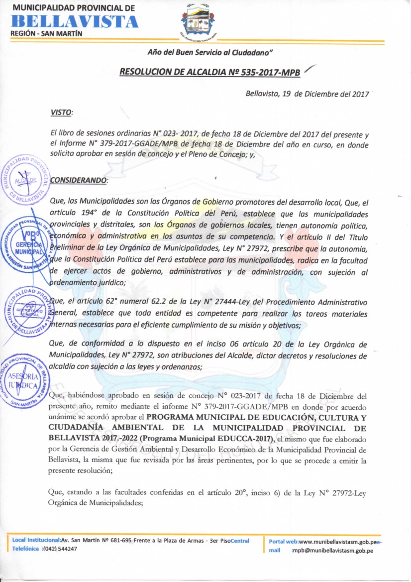 La presente Resolución aprueba el Programa Municipal de Educación, Cultura y Ciudadanía Ambiental de la Municipalidad Provincial de Bellavista, para el periodo 2017 - 2022; con la finalidad de promover la cultura y la educación ambiental para la formación de ciudadanas y ciudadanos ambientalmente responsables e incentivar la participación ciudadana en todos sus niveles.