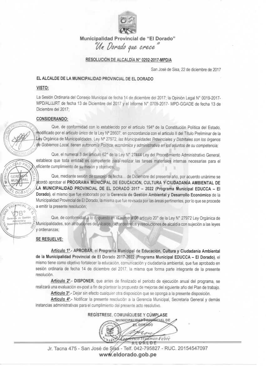 La presente Resolución aprueba el Programa Municipal de Educación, Cultura y Ciudadanía Ambiental de la Municipalidad Provincial de El Dorado, para el periodo 2017 - 2022; con la finalidad de promover la cultura y la educación ambiental para la formación de ciudadanas y ciudadanos ambientalmente responsables e incentivar la participación ciudadana en todos sus niveles.