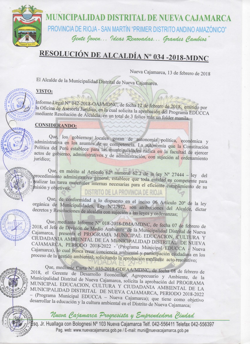 Programa Municipal de Educación, Cultura y Ciudadanía Ambiental de la Municipalidad Distrital de Nueva Cajamarca 2018 – 2022
