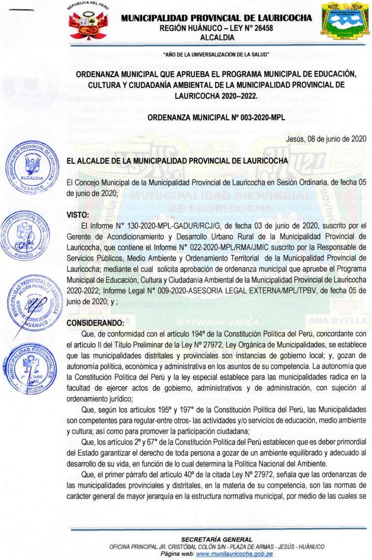 Programa Municipal de Educación, Cultura y Ciudadanía Ambiental de la Municipalidad Provincia de Lauricocha 2020 - 2022