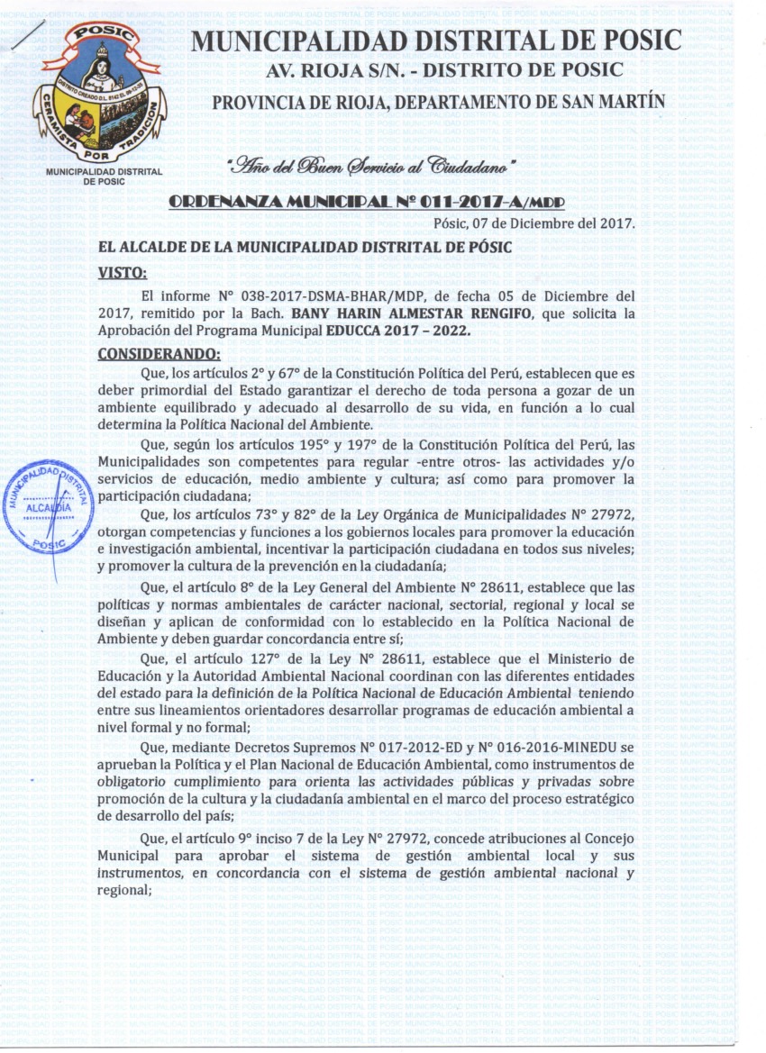 La presente Ordenanza aprueba el Programa Municipal de Educación, Cultura y Ciudadanía Ambiental de la Municipalidad Distrital de Posic, para el periodo 2017 - 2022; con la finalidad de promover la cultura y la educación ambiental para la formación de ciudadanas y ciudadanos ambientalmente responsables e incentivar la participación ciudadana en todos sus niveles.