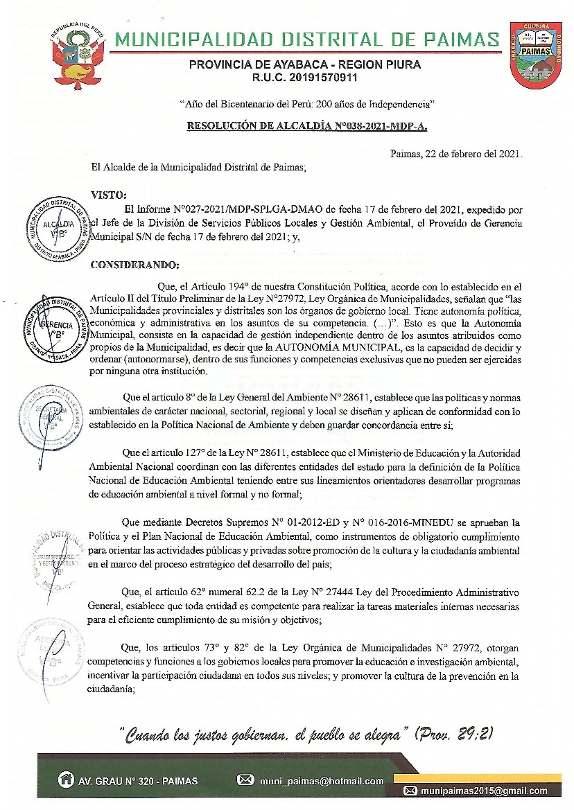La presente Resolución aprueba el Programa Municipal de Educación, Cultura y Ciudadanía Ambiental de la Municipalidad Distrital de Paimas, para el periodo 2021 - 2022; con la finalidad de promover la cultura y la educación ambiental para la formación de ciudadanas y ciudadanos ambientalmente responsables e incentivar la participación ciudadana en todos sus niveles.