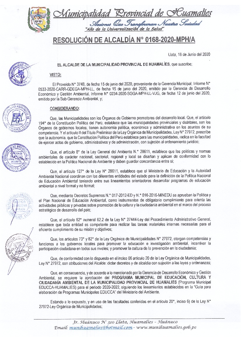 La presente Resolución aprueba el Programa Municipal de Educación, Cultura y Ciudadanía Ambiental de la Municipalidad Provincia de Huamalíes, para el periodo 2020- 2022; con la finalidad de promover la cultura y la educación ambiental para la formación de ciudadanas y ciudadanos ambientalmente responsables e incentivar la participación ciudadana en todos sus niveles.