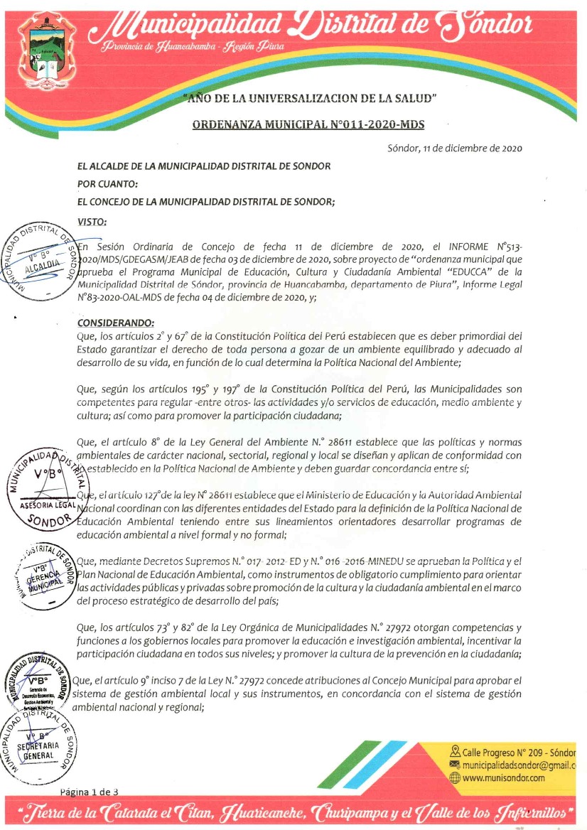 La presente Ordenanza aprueba el Programa Municipal de Educación, Cultura y Ciudadanía Ambiental de la Municipalidad Distrital de Sondor, para el periodo 2021 - 2022; con la finalidad de promover la cultura y la educación ambiental para la formación de ciudadanas y ciudadanos ambientalmente responsables e incentivar la participación ciudadana en todos sus niveles.