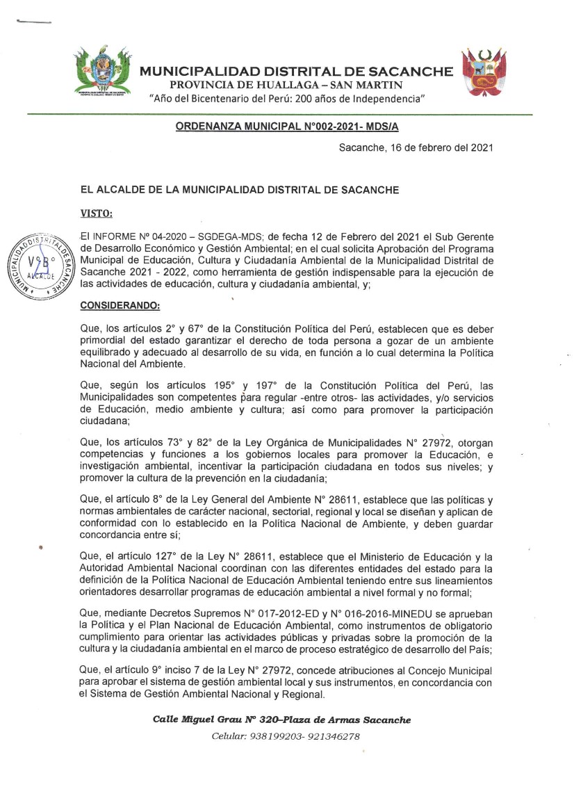 La presente Ordenanza aprueba el Programa Municipal de Educación, Cultura y Ciudadanía Ambiental de la Municipalidad Distrital de Sacanche, para el periodo 2021 - 2022; con la finalidad de promover la cultura y la educación ambiental para la formación de ciudadanas y ciudadanos ambientalmente responsables e incentivar la participación ciudadana en todos sus niveles.