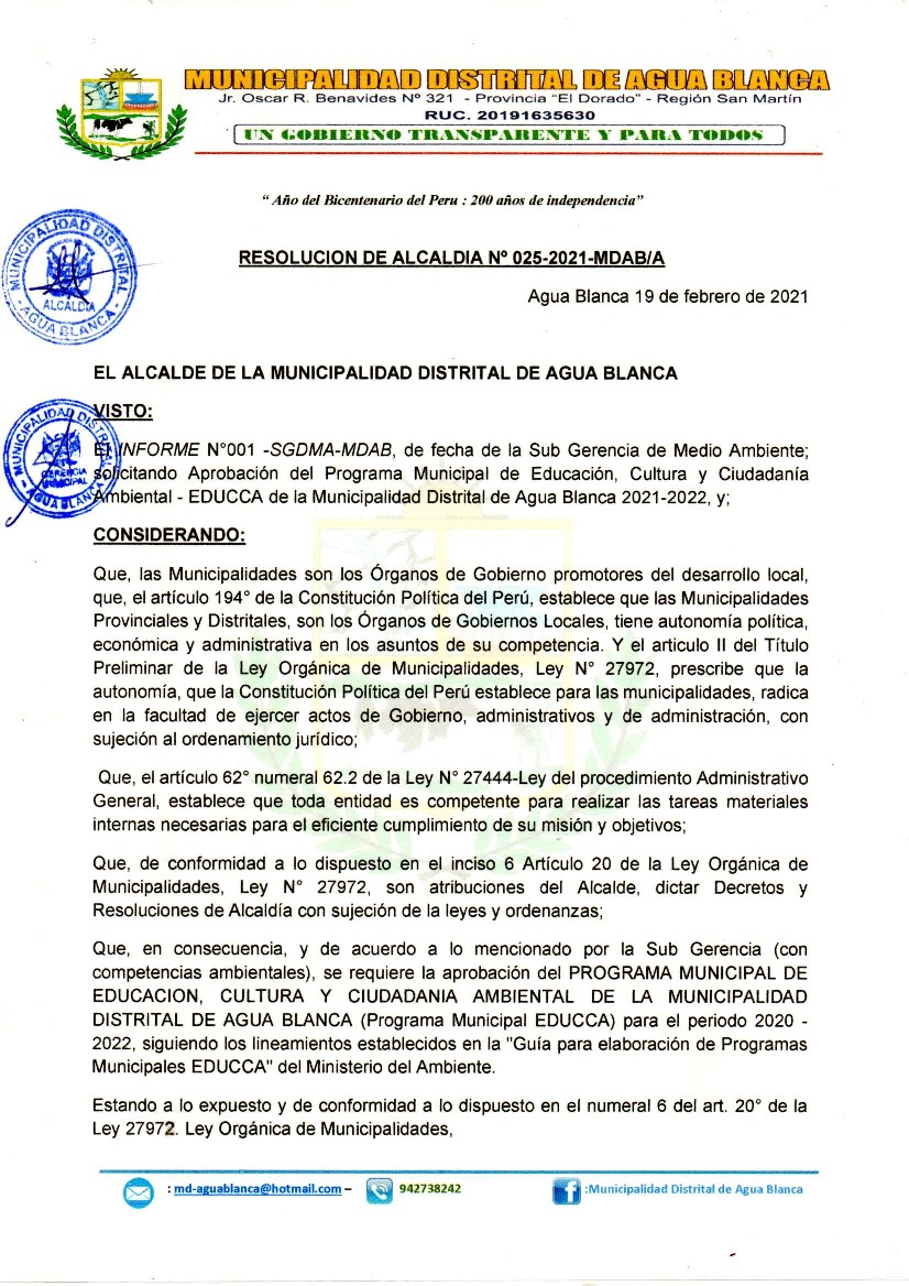 La presente Resolución aprueba el Programa Municipal de Educación, Cultura y Ciudadanía Ambiental de la Municipalidad Distrital de Agua Blanca, para el periodo 2021 - 2022; con la finalidad de promover la cultura y la educación ambiental para la formación de ciudadanas y ciudadanos ambientalmente responsables e incentivar la participación ciudadana en todos sus niveles.