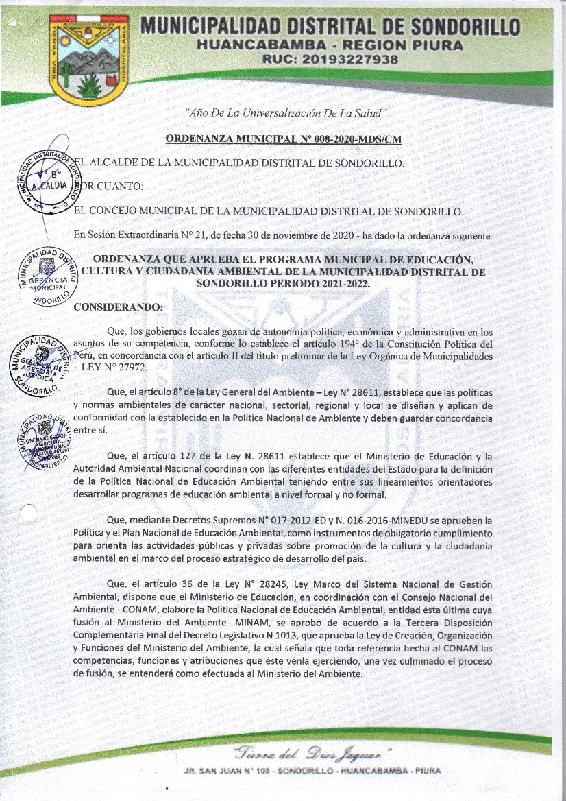 La presente Ordenanza aprueba el Programa Municipal de Educación, Cultura y Ciudadanía Ambiental de la Municipalidad Distrital de Sondorillo, para el periodo 2021 - 2022; con la finalidad de promover la cultura y la educación ambiental para la formación de ciudadanas y ciudadanos ambientalmente responsables e incentivar la participación ciudadana en todos sus niveles.
