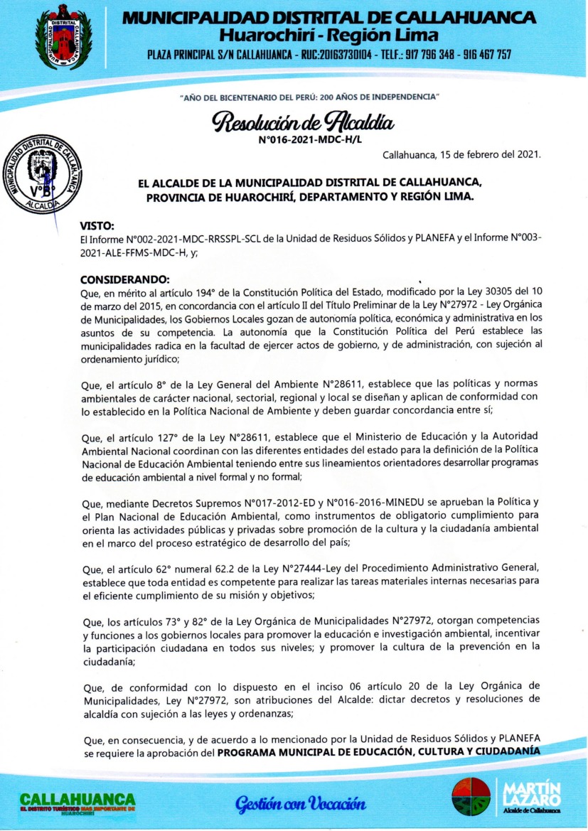 La presente Resolución aprueba el Programa Municipal de Educación, Cultura y Ciudadanía Ambiental de la Municipalidad Distrital de Callahuanca para el periodo 2021-2022 con la finalidad de promover la cultura y la educación ambiental para la formación de ciudadanas y ciudadanos ambientalmente responsables e incentivar la participación ciudadana en todos sus niveles