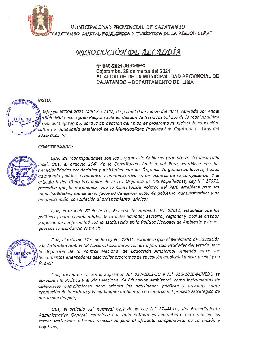 La presente Resolución aprueba el Programa Municipal de Educación, Cultura y Ciudadanía Ambiental de la Municipalidad Provincial de Cajatambo, para el periodo 2021- 2022; con la finalidad de promover la cultura y la educación ambiental para la formación de ciudadanas y ciudadanos ambientalmente responsables e incentivar la participación ciudadana en todos sus niveles.