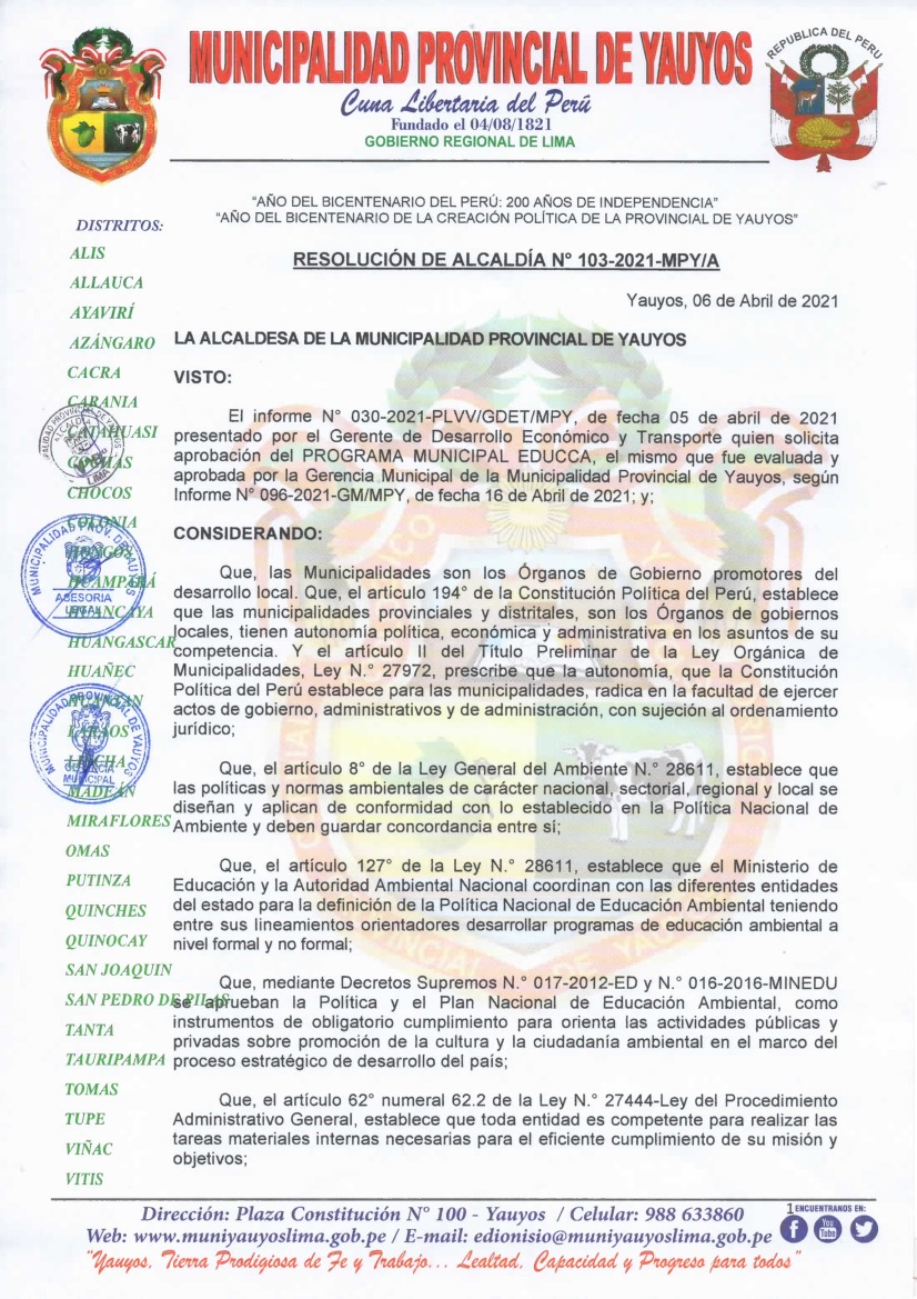 La presente Resolución aprueba el Programa Municipal de Educación, Cultura y Ciudadanía Ambiental de la Municipalidad Provincial de Yauyos, para el periodo 2021- 2022; con la finalidad de promover la cultura y la educación ambiental para la formación de ciudadanas y ciudadanos ambientalmente responsables e incentivar la participación ciudadana en todos sus niveles.