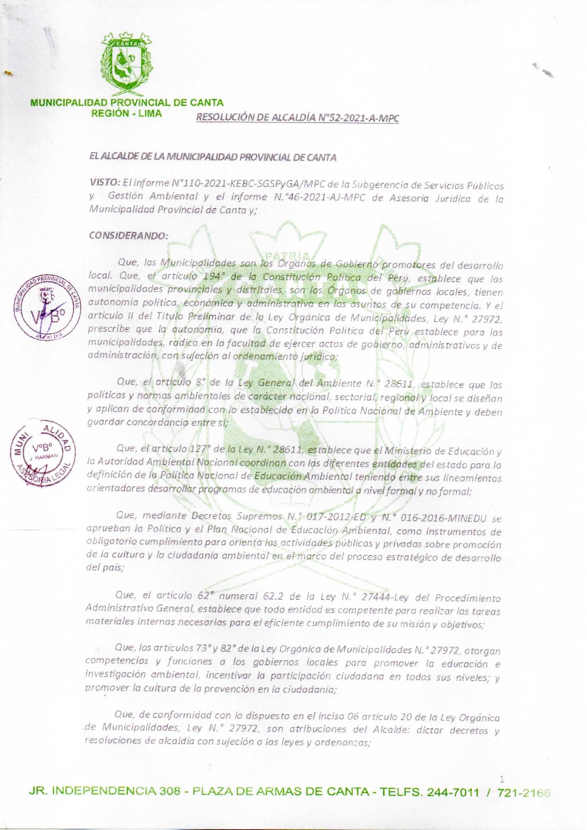 La presente Resolución aprueba el Programa Municipal de Educación, Cultura y Ciudadanía Ambiental de la Municipalidad Provincial de Canta, para el periodo 2021- 2022; con la finalidad de promover la cultura y la educación ambiental para la formación de ciudadanas y ciudadanos ambientalmente responsables e incentivar la participación ciudadana en todos sus niveles.