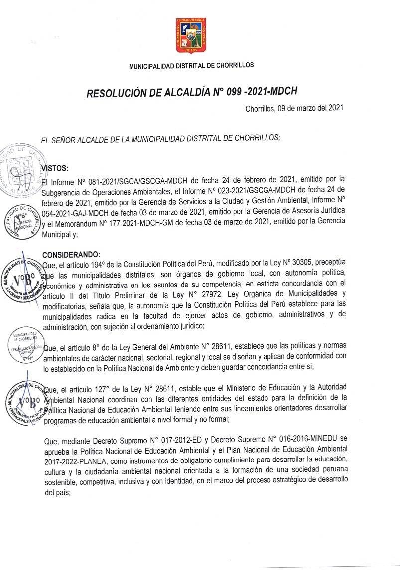 La presente Resolución aprueba el Programa Municipal de Educación, Cultura y Ciudadanía Ambiental de la Municipalidad Distrital de Chorrillos, para el periodo 2021 - 2022; con la finalidad de promover la cultura y la educación ambiental para la formación de ciudadanas y ciudadanos ambientalmente responsables e incentivar la participación ciudadana en todos sus niveles.