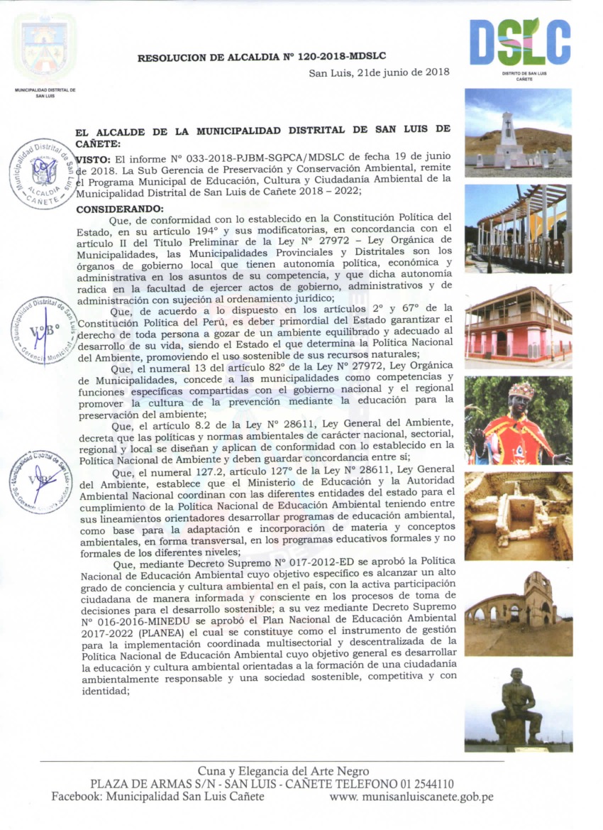 La presente Resolución aprueba el Programa Municipal de Educación, Cultura y Ciudadanía Ambiental de la Municipalidad Distrital de San Luis, para el periodo 2018- 2022; con la finalidad de promover la cultura y la educación ambiental para la formación de ciudadanas y ciudadanos ambientalmente responsables e incentivar la participación ciudadana en todos sus niveles.