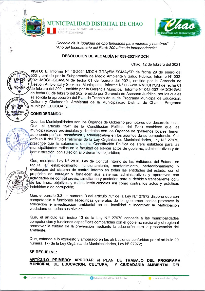 La presente Resolución aprueba el Programa Municipal de Educación, Cultura y Ciudadanía Ambiental de la Municipalidad Distrital de Chao, para el periodo 2021- 2022; con la finalidad de promover la cultura y la educación ambiental para la formación de ciudadanas y ciudadanos ambientalmente responsables e incentivar la participación ciudadana en todos sus niveles.